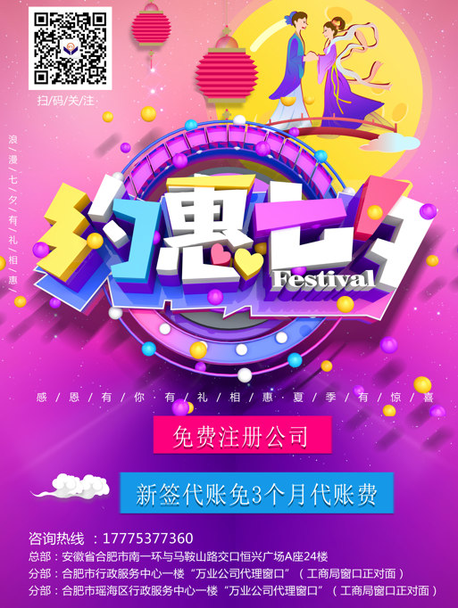 七夕情人節 七夕節,又名乞巧節、七巧節或七姐誕,發源于中國,是華人地區以及東亞各國的傳統節日,該節日來自于牛郎與織女的傳說,七夕現已成為中國情人節。 一年一度的七夕情人節(虐汪日)又到了 安徽萬業祝全天下有情人 終成眷屬 在這樣特殊的日子里 怎么少得了優惠活動呢? 安徽萬業特此推出優惠大派送 快來圍觀!! 一大波送禮高潮正在趕來 01 免費注冊公司 02 新簽代賬免3個月代賬費 如此優惠的活動還不趕緊行動起來! 選擇萬業幫您輕松創業,省心、省力、省時、贏在起跑線,成功快一步!同時簽約成功者還可以免費介紹男女朋友喔