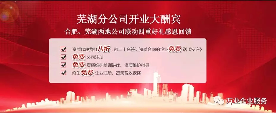 說到這里怎么能少得了優(yōu)惠活動呢 福利時間到! 為了感謝大家長期以來一直對本司的支持 特推出開業(yè)大酬賓活動 合肥、蕪湖兩地公司聯(lián)動四重好禮感恩回饋??! 免費(fèi)福利 1 資質(zhì)代理費(fèi)打八折,前二十名簽訂資質(zhì)合同的企業(yè)免費(fèi)送《安許》 2 免費(fèi)公司注冊 3 免費(fèi)資質(zhì)維護(hù)培訓(xùn)講座、資質(zhì)維護(hù)指導(dǎo) 4 終生免費(fèi)企業(yè)注冊、高額稅收返還 說了這么多,快跟隨小編一睹新公司的風(fēng)采吧! 開分公司對于我們來說是挑戰(zhàn)也是機(jī)遇,挑戰(zhàn)在于外部環(huán)境,機(jī)遇在于面對挑戰(zhàn)我們?nèi)匀荒軌蚩焖偬幚聿⑶也粩嘧晕覂?yōu)化?,F(xiàn)分公司需要做的就是充分發(fā)揮我們的優(yōu)勢,希望在這座城市里能夠做出更好的成績來回饋大家。謝謝大家長期以來的支持,安徽萬業(yè)才能更好的成長為大家提供更優(yōu)質(zhì)的服務(wù)!我們相信,蕪湖分公司這艘滿載著希望的巨輪,定能乘風(fēng)破浪到達(dá)成功的彼岸!