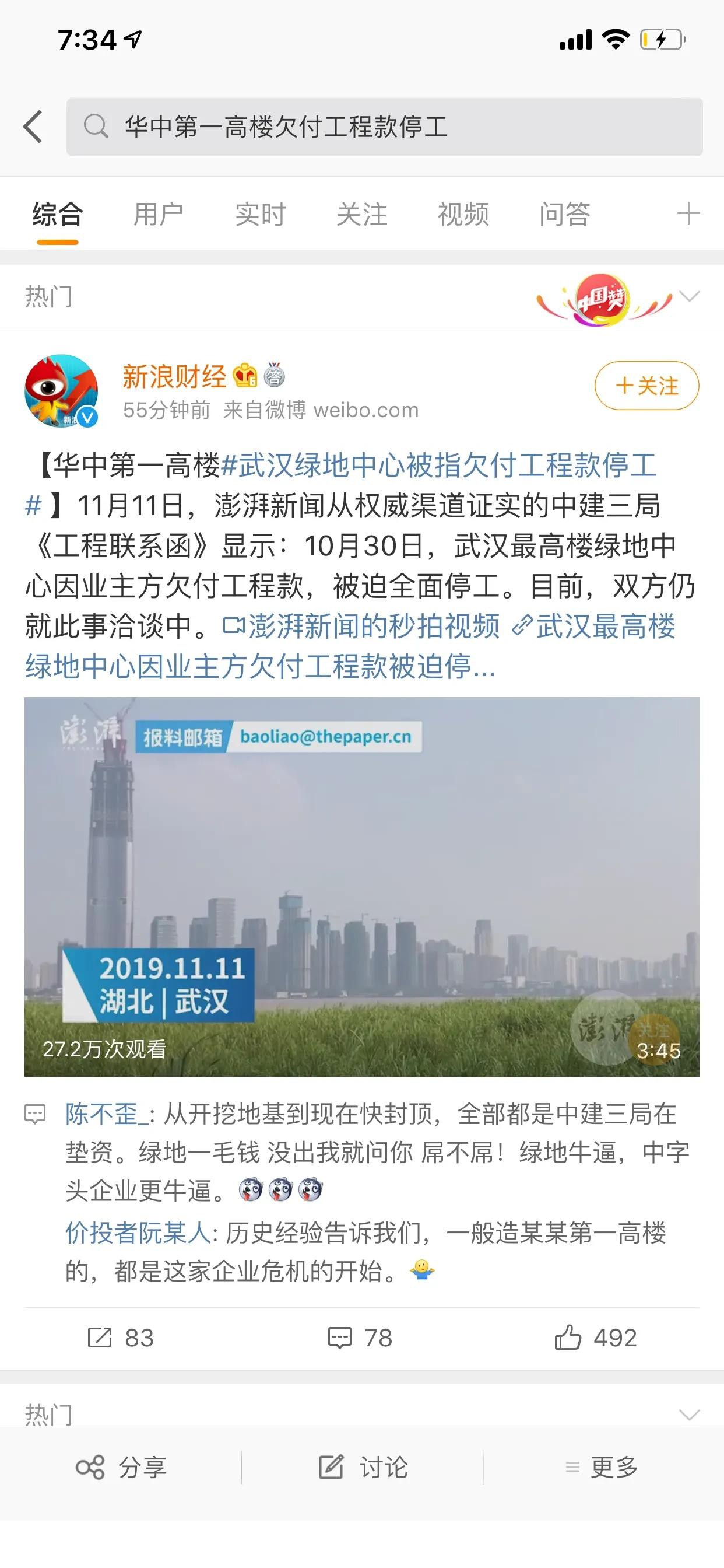 11月11日,澎湃新聞從權威渠道證實的中建三局《工程聯(lián)系函》顯示:10月30日,武漢最高樓綠地中心因業(yè)主方欠付工程款,被迫全面停工。目前,雙方仍就此事洽談中。