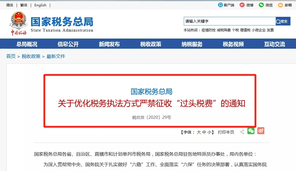 國家稅務(wù)總局 關(guān)于優(yōu)化稅務(wù)執(zhí)法方式嚴禁征收“過頭稅費”的通知 稅總發(fā)〔2020〕29號 國家稅務(wù)總局各省、自治區(qū)、直轄市和計劃單列市稅務(wù)局,國家稅務(wù)總局駐各地特派員辦事處,局內(nèi)各單位: 為深入貫徹黨中央、國務(wù)院關(guān)于扎實做好“六穩(wěn)”工作、全面落實“六保”任務(wù)的決策部署,認真落實國務(wù)院常務(wù)會議有關(guān)精神,進一步提升政治站位,充分發(fā)揮稅收職能作用,統(tǒng)籌推進疫情防控和支持經(jīng)濟社會發(fā)展,現(xiàn)就優(yōu)化稅務(wù)執(zhí)法方式、嚴禁征收“過頭稅費”有關(guān)要求進一步強調(diào)如下: 一、堅決防止違規(guī)征稅收費 各級稅務(wù)機關(guān)要進一步堅持依法規(guī)范組織收入原則不動搖,堅決壓實主體責(zé)任,嚴禁征收“過頭稅費”、違規(guī)攬稅收費以及以清繳補繳為名增加市場主體不合理負擔(dān)。堅決不搞大規(guī)模集中清欠、大面積行業(yè)檢查,堅決禁止采取空轉(zhuǎn)、轉(zhuǎn)引稅款等手段虛增收入。建立健全稅費收入質(zhì)量監(jiān)控和分析機制,利用大數(shù)據(jù)完善分區(qū)縣、分稅種、分時段的收入實時監(jiān)控體系,對收入畸高畸低等異常情況,及時分析排查,發(fā)現(xiàn)違法違規(guī)行為一律嚴肅處理,并建立典型案例通報制度,強化以案示警的作用。要積極向地方黨委、政府和相關(guān)部門匯報,進一步爭取對依法依規(guī)組織稅費收入的支持,避免采取不當(dāng)?shù)慕M織收入措施。上級稅務(wù)部門要加強對下級稅務(wù)部門組織收入工作的監(jiān)督指導(dǎo),想方設(shè)法幫助其化解征收工作面臨的矛盾和壓力。 二、不斷改進稅收風(fēng)險管理 健全事前事中事后全流程稅收風(fēng)險管理運行機制,進一步完善基于大數(shù)據(jù)的“雙隨機、一公開”“信用+風(fēng)險”監(jiān)管方式,切實增強稅收風(fēng)險管理的針對性和有效性,既有效防范和打擊偷騙稅行為,又盡最大可能不影響企業(yè)正常生產(chǎn)經(jīng)營。統(tǒng)籌發(fā)揮好稅收風(fēng)險管理服務(wù)自主遵從和規(guī)范稅收秩序的功能,以服務(wù)為導(dǎo)向,強化事前精準提示提醒,不得組織對某一行業(yè)開展多年期、撒網(wǎng)式的風(fēng)險推送和自查補繳稅費,重視和保障納稅人、繳費人對推送風(fēng)險的自訴權(quán)益,促進其及時補正、精準糾錯,避免違法違規(guī)風(fēng)險;以規(guī)范為目的,強化事中精準控制、事后精準應(yīng)對,嚴厲精準打擊“假企業(yè)”“假出口”“假申報”等涉稅違法行為,防止稅收流失,維護國家稅收安全。 三、積極支持新業(yè)態(tài)健康發(fā)展 主動適應(yīng)新經(jīng)濟不斷發(fā)展的新要求,持續(xù)完善支持電子商務(wù)、“互聯(lián)網(wǎng)+”等新興業(yè)態(tài)發(fā)展的稅收政策體系和管理服務(wù)措施,大力培育新興經(jīng)濟增長點。繼續(xù)堅持包容審慎的原則,不得專門針對某一新興業(yè)態(tài)、新型商業(yè)模式,組織開展全面風(fēng)險應(yīng)對和稅務(wù)檢查。積極運用稅收大數(shù)據(jù),深入分析線上經(jīng)濟發(fā)展情況,完善精準化、精細化稅收服務(wù)和管理措施,促進線上線下融合,支持新興業(yè)態(tài)持續(xù)健康發(fā)展。 四、不折不扣落實稅費優(yōu)惠政策 進一步落實落細黨中央、國務(wù)院出臺的系列稅費優(yōu)惠政策,不斷鞏固和拓展政策實施成效。結(jié)合疫情防控,動態(tài)更新《支持疫情防控和經(jīng)濟社會發(fā)展稅費優(yōu)惠政策指引》,及時通過“云課堂”、線上答疑等方式,回應(yīng)稅收熱點問題,深入開展針對性政策解讀和輔導(dǎo),助力納稅人、繳費人應(yīng)享盡享。適時開展減稅降費督查,狠抓發(fā)現(xiàn)問題整改,強化跟蹤問效,暢通政策落實“最后一公里”,確保減稅降費政策紅利直達困難企業(yè)、直達市場主體。 五、持續(xù)優(yōu)化辦稅繳費服務(wù) 大力鞏固拓展“非接觸式”辦稅繳費服務(wù),進一步擴大網(wǎng)上辦稅繳費事項范圍,確保主要辦稅繳費事項均能網(wǎng)上辦理。簡化優(yōu)化稅費申報手續(xù),加快推進增值稅、消費稅、城市維護建設(shè)稅主附稅合并申報和財產(chǎn)行為稅一體化納稅申報。繼續(xù)深化與銀保監(jiān)部門和銀行業(yè)金融機構(gòu)的合作,搭建“稅銀互動”信息共享平臺,擴大受益范圍,增進線上辦理便利,更好滿足企業(yè)特別是民營企業(yè)和小微企業(yè)信貸需求,助力緩解市場主體融資難題。 六、切實轉(zhuǎn)變工作作風(fēng) 各級稅務(wù)機關(guān)要根據(jù)經(jīng)濟社會發(fā)展的新形勢新情況,創(chuàng)新工作思路和工作方式,不能用老辦法解決新問題,不能用泛泛的方法解決個性化的問題。要妥善處理好稅收與經(jīng)濟社會發(fā)展的關(guān)系,準確把握稅務(wù)執(zhí)法的時度效,提高工作的精準性和精細度,防止粗放式管理和執(zhí)法。要通過12366納稅服務(wù)熱線、稅務(wù)網(wǎng)站等渠道和實地走訪、第三方調(diào)查等方式,深入開展向納稅人、繳費人問需活動,積極幫助紓困解難,及時回應(yīng)社會關(guān)切,以作風(fēng)建設(shè)的新成效,促進稅收工作質(zhì)效新提升。 國家稅務(wù)總局 2020年6月18日
