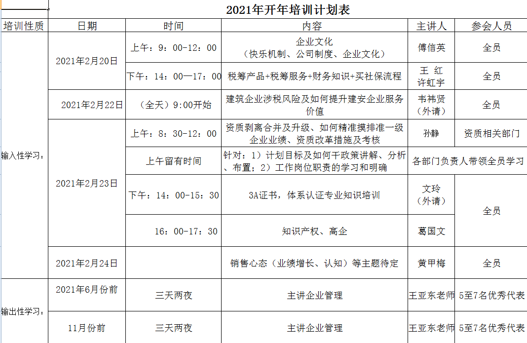 新年伊始,萬(wàn)象更新,鞭炮映日,開(kāi)工起航!為迎新年新氣象,賦能打好第一槍?zhuān)?/font>2月20日安徽萬(wàn)業(yè)2021年開(kāi)年培訓(xùn)正式開(kāi)啟,培訓(xùn)從2月20日9:00起至2月23日18:00,為期三天!開(kāi)年培訓(xùn)是萬(wàn)業(yè)的傳統(tǒng),全員參加,大家一起汲取知識(shí)和能量,為新一年的戰(zhàn)斗積蓄能量!萬(wàn)業(yè)的家人們?cè)诠炯袑W(xué)習(xí),通過(guò)公司內(nèi)部員工、外請(qǐng)老師、黃總等主持講課,讓大家接受了這場(chǎng)開(kāi)年培訓(xùn)的潤(rùn)澤。新年伊始,萬(wàn)象更新,鞭炮映日,開(kāi)工起航!為迎新年新氣象,賦能打好第一槍?zhuān)?月20日安徽萬(wàn)業(yè)2021年開(kāi)年培訓(xùn)正式開(kāi)啟,培訓(xùn)從2月20日9:00起至2月23日18:00,為期三天!
